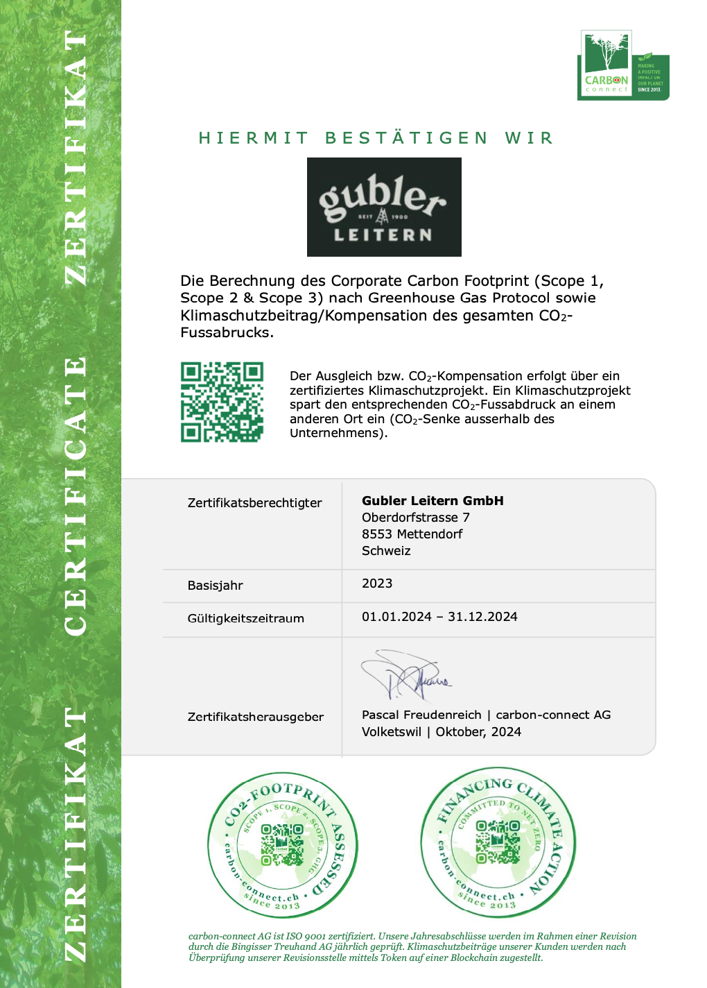 Zertifikat Gubler Leitern GmbH CO2-Fussabdruck und Klimaschutzbeitrag/CO2-Kompensation carbon-connect.